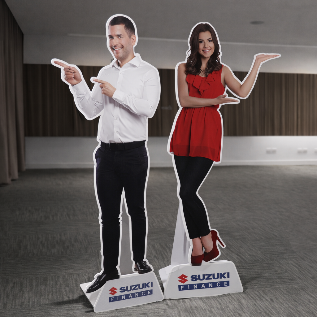 Displays publicitarios en tamaño real fabricados en PVC espumado (Sintra) de 12 mm, ideales para eventos, lanzamientos y activaciones de marca.