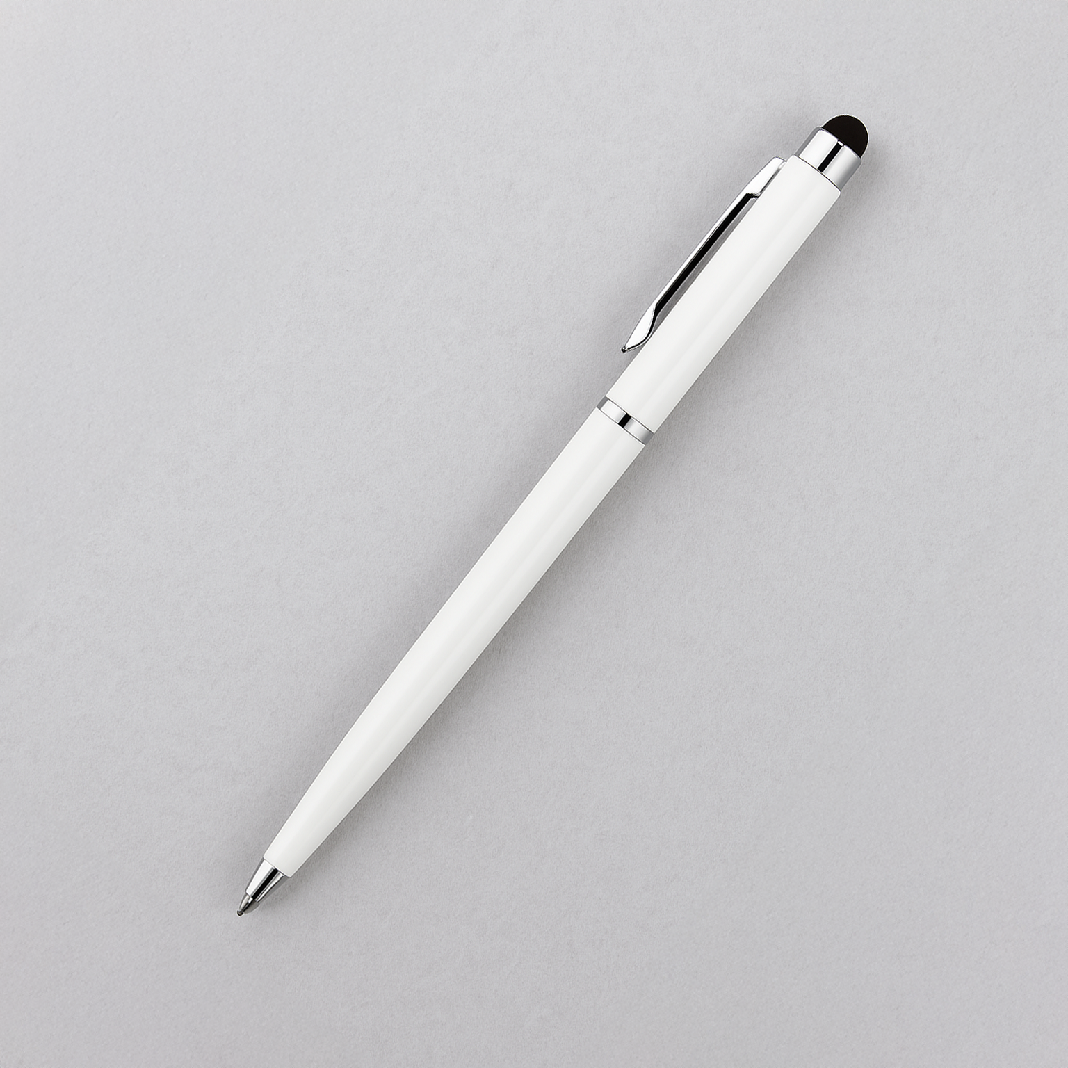 Este elegante lapicero blanco combina funcionalidad y tecnología. Cuenta con una punta de goma táctil en el extremo superior, ideal para usar en pantallas de celulares, tablets o cajeros automáticos sin dejar huellas. Su diseño moderno con clip metálico lo hace perfecto para oficinas, promociones ejecutivas y campañas de marketing. Personalízalo con tu logo para mayor impacto.